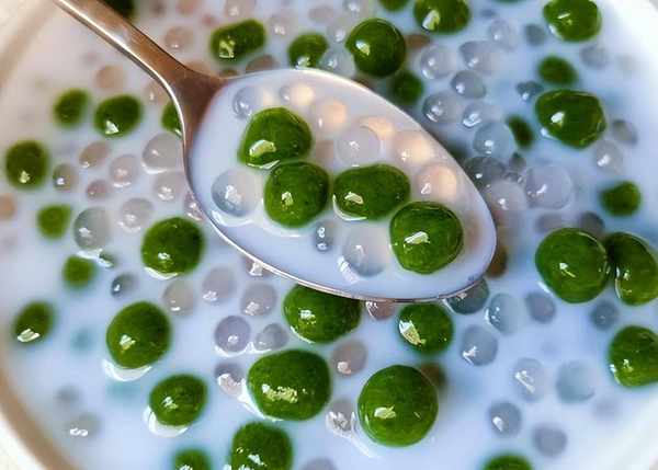 將熬好的艾草汁倒入煮好的西米中,加入適量的白糖攪拌均勻即可。