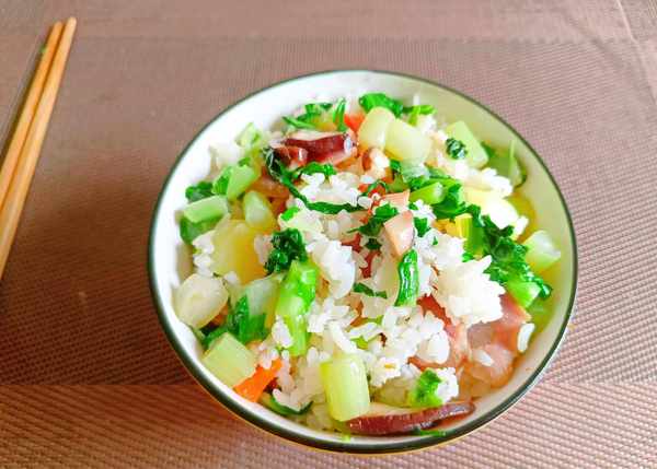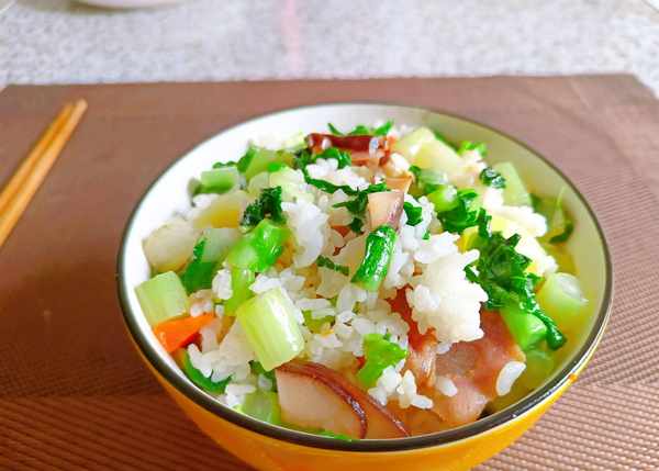 ③等電飯煲跳到保溫狀態時,燜3分鐘取出來,倒入香菇菜苔,再加一點點鹽拌一拌。