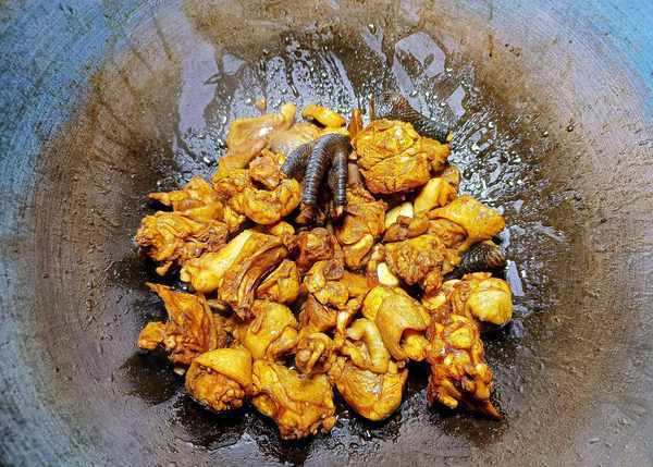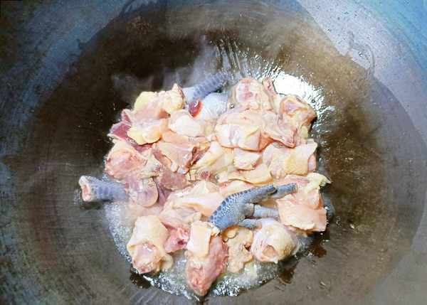 ①我們把雞剁成小塊,泡入水中30分鐘。反復搓洗,去掉表面雜質。撈出,瀝幹水分。鍋中滑油,倒入雞塊煸炒。等炒幹雞塊表面水分後再加點料酒去腥,翻炒1分鐘。