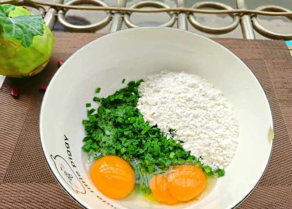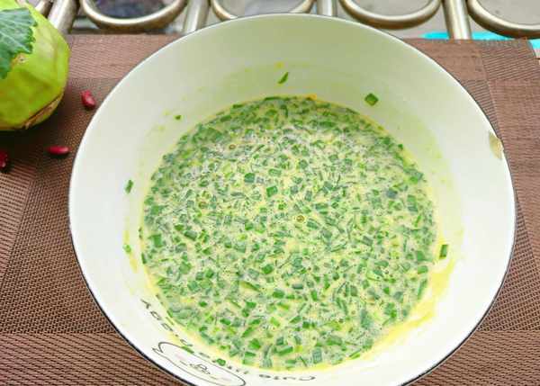 ①我們把韭菜泡入水中10分鐘,搓洗幹凈。切掉尾部一截,再切成碎末放入碗中。打入雞蛋、加點鹽、面粉進去,攪拌一下。