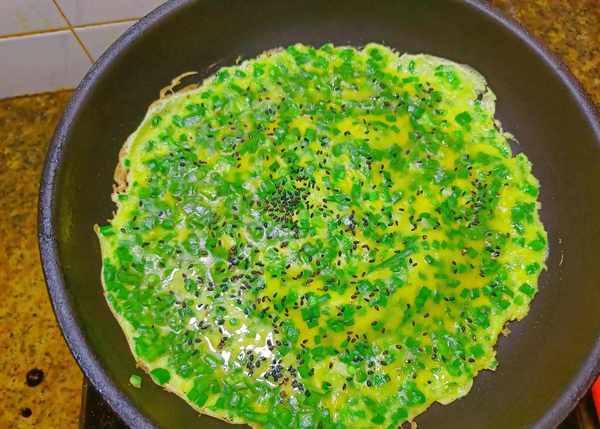 ③平底鍋刷油,倒入韭菜雞蛋面糊煎。等底部微微定型後沿著鍋邊鏟起來,翻一面繼續煎。可以加一點芝麻,香氣更濃。