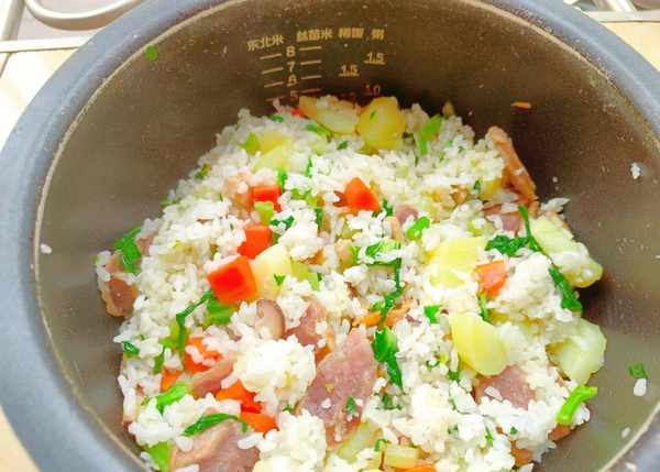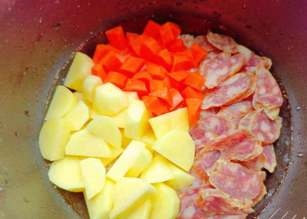 ①我們把大米提前用冷水泡發1個小時,淘洗幹凈後放入電飯煲中。去掉土豆皮,洗幹凈,切成小塊放入電飯煲。胡蘿卜和臘腸也洗幹凈,切小塊放入鍋中。加入冷水,水量和食材齊平,開始煮米飯。