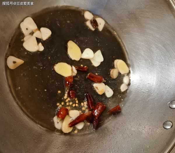 3、起鍋燒油,下入薑、蒜爆香,再下入幹辣椒爆一下辣味,如果不吃辣,可以不加。下入口蘑片,快速翻炒均勻。