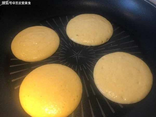 4、取平底鍋,不要加油,開小火燒熱,舀起一勺面糊,放入平底鍋中。其他面糊也舀下去,舀好後不要翻動,蓋上蓋,燜煎90秒鐘左右,看到玉米餅表面稍微凝固,且出現小氣泡,就可以瞭,輕輕鏟起來,翻個面,再蓋蓋,煎90秒鐘。煎至兩面金黃,就完成瞭。