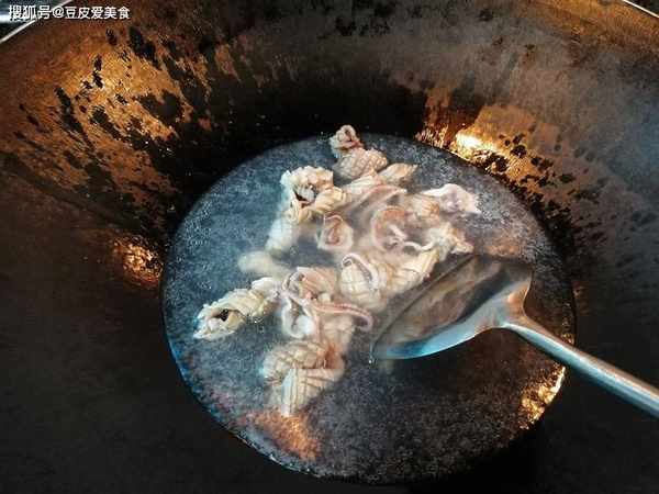 2、鍋裡燒開水,水開後下入魷魚,焯煮20秒鐘,撈出,瀝幹水分。註意不能焯太久。