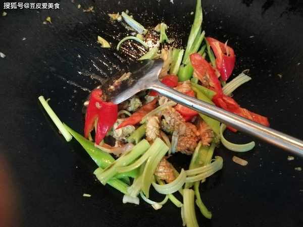 4、下入香芹、青紅椒,快速翻炒至斷生,下和鹽、白砂糖和雞精調味,出鍋,完成。