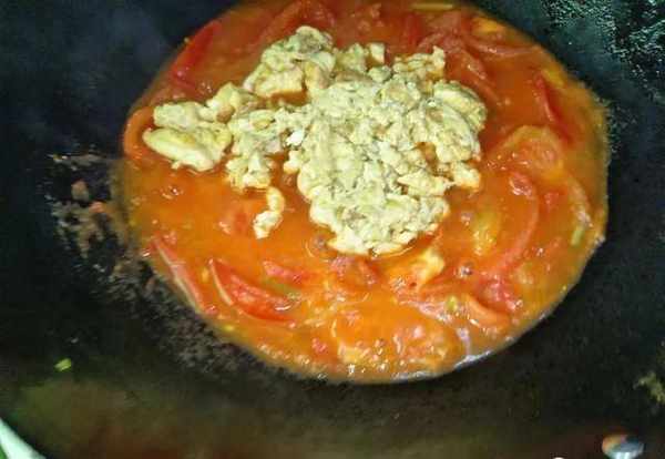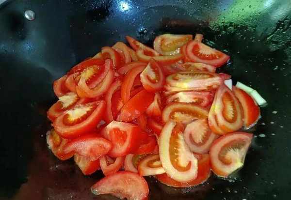 3.鍋裡面再倒入油,將切好的西紅柿塊倒入裡面,西紅柿下鍋,用鏟子給它翻炒均勻。鍋裡面的西紅柿有點微微反沙之後我們再把雞蛋放入裡面;