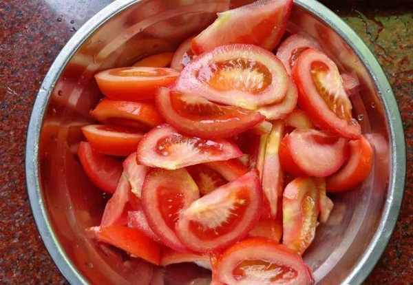 1.將備好的西紅柿放在清水中沖洗幹凈,洗凈之後放在案板上給它切成小塊,切好後放一旁;