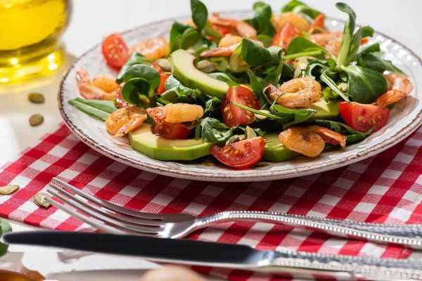 做法:蝦剪去蝦須、蝦腳,清水洗凈後炒熟備用;加入羅勒、牛油果片、沙拉菜、聖女果、沙拉醬等拌勻即可。