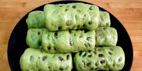 2、搓成長條。分成均等小劑子。把每一個小劑子揉圓,然後搓成長條按扁,用搟面杖搟成一個長方形的薄片。中間撒一點蜜紅豆,再把兩邊給折過來按壓一下。翻個面,用搟面杖搟開。然後再翻過來,中間鋪上紅棗碎,從一頭卷起來整理一下。全部做好,放進蒸籠裡面,蓋上蓋子發酵好以後。水開之後蒸15分鐘。關火燜一分鐘,艾草紅豆卷就做好瞭。
