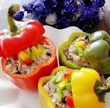 7、用攪拌均勻的混合物填滿彩椒,放進蒸屜。