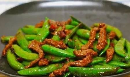 材料:甜豆500g、牛柳100g、蒜蓉若幹、幹椒碎少許、蠔油、生抽、淀粉、油。
