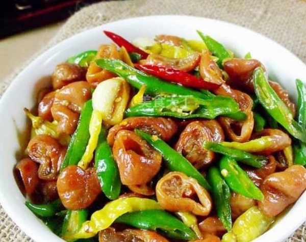 青尖椒2個;紅朝天椒1個;幹紅辣椒1個;鹵好的熟豬肥腸500g;生薑、蒜瓣(拍碎)少量;食用油適量;生抽適量;黃酒(料酒)適量;白糖2湯匙;鹽適量