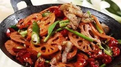 4、鍋留底油燒熱,放入蔥薑、幹辣椒、花椒炸出香味,放入胡蘿卜片、青紅辣椒翻炒均勻;再放入肉片、淋入調味汁迅速拌勻;色後放入黃瓜片拌勻即可出鍋。