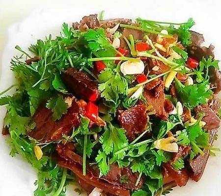 2、煮牛肉的時候,把香菜用流動的清水洗凈備用。取切熟食的案板,把牛肉撈起切成薄片,香菜切成碎末,蒜瓣也拍碎備用。