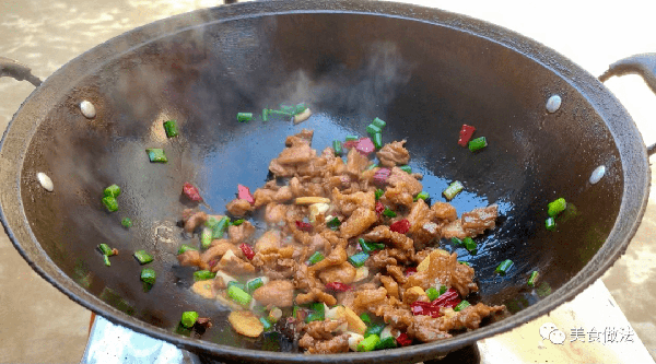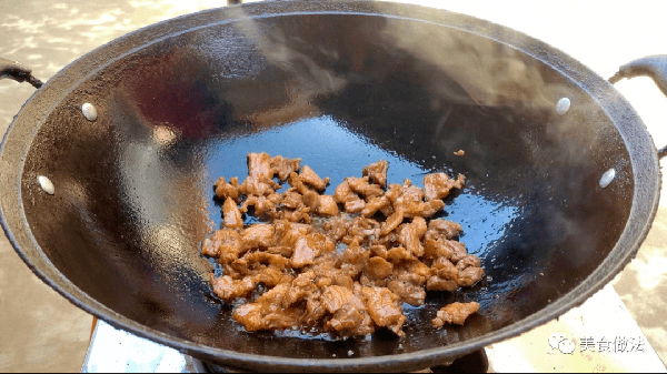 等鐵鍋燒熱後,我們給它多放一些油,油熱後把肉片下入鍋,調入中大火給它煸炒一會,炒出多餘的水分,把水分炒幹後少來一點料酒給它去去腥,繼續翻炒片刻。
