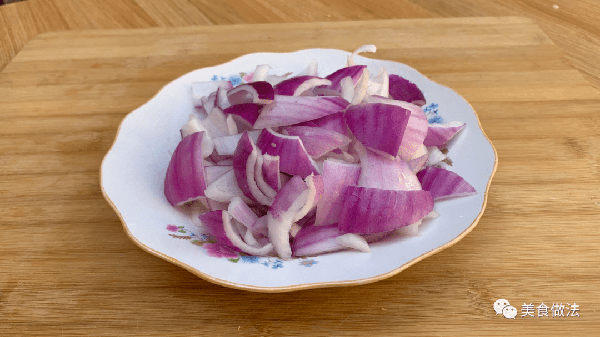 做洋蔥炒肉我們最好選用紫皮洋蔥,把洋蔥去皮以後先切成兩半,然後再把它切成小塊。