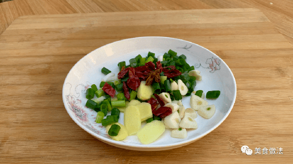 再把蔥,薑,蒜,分別切成小塊放入碗中,能吃辣的在放入一小把幹辣椒和一顆八角來增加香味。