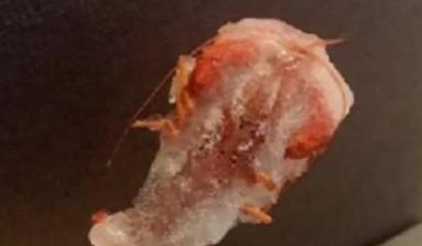 拆開冰棒的包裝袋,看起來是那種小冰塊似的。吃起來也是有些甜甜的感覺,像雪碧又像是老冰棒。這個冰棒特別的地方在於,裡面有一隻小龍蝦,而且是真的能吃的小龍蝦。