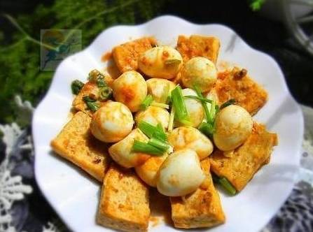 材料:鵪鶉蛋150克、豆腐1塊、鹽1小勺、蠔油1大勺、番茄沙司1大勺、油適量、香蔥2根