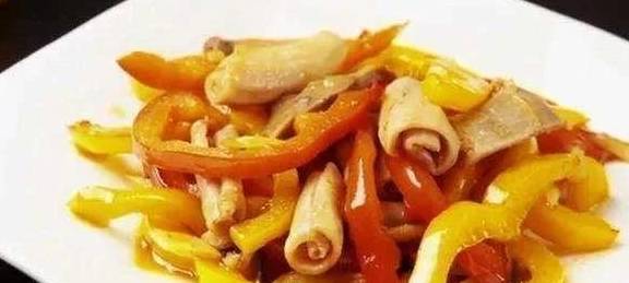 做法:1.將洗凈的彩椒切成絲;把洗好的鴨腸切成段;