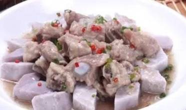 材料:排骨一條、荔浦芋頭一塊、蒜蓉適量、料酒適量、生抽適量、雞粉適量、白糖適量、鹽適量、油適量、胡椒粉適量、辣椒粉、蔥花、生粉適量;