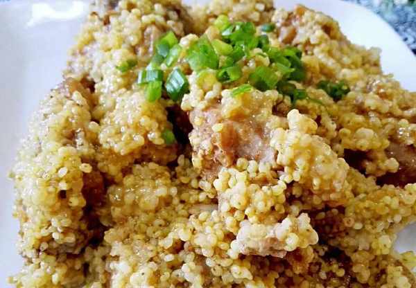 食材:小米、排骨、土豆、白糖、鹽、生抽、料酒、耗油、辣椒醬