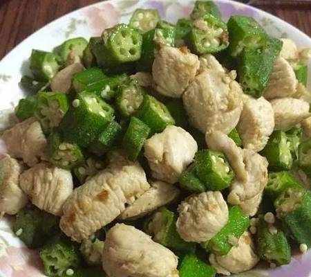 材料:秋葵300克、雞胸肉200克、黑胡椒適量、料酒一湯匙、淀粉5克、生抽二茶匙、橄欖油適量、鹽適量、辣椒醬一茶匙;