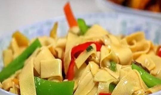做法:1.青筍、水面筋、魷魚和千張,全部切成長段。