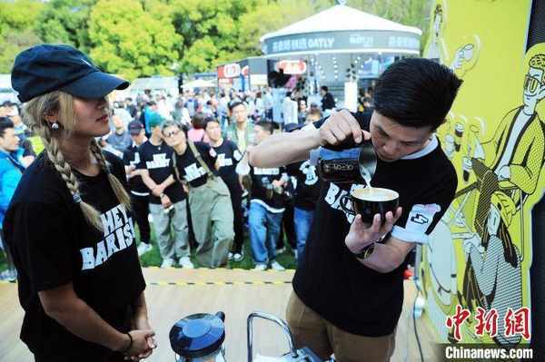 咖啡師在展示拉花技藝。 湯彥俊 攝
