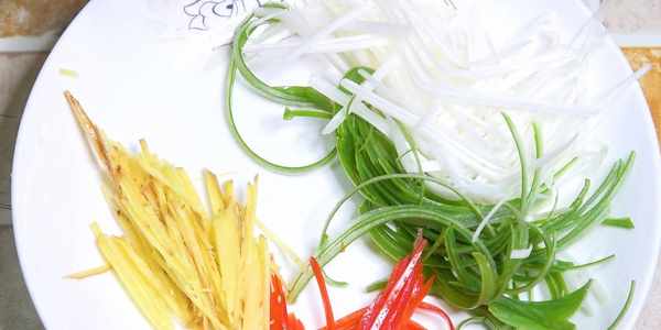 泡魚的時候來準備輔料,一小段大蔥的蔥白切成蔥絲備用。很多朋友切不好蔥絲,其實很簡單,先把大蔥從中間切一刀,不要切斷,然後折疊一下,就可以輕松地切成細絲瞭。再切一點大蔥的蔥葉,也切成絲,搭配一點綠色會更好看。再切一點紅椒絲,紅椒不僅可以提鮮增香,而且顏色也很好看。再切一點蔥絲去腥增香。把切好的輔料放入清水碗裡泡著,過幾分鐘就會自然地卷成漂亮的小卷。