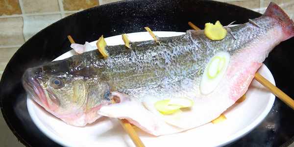 然後準備一個蒸魚的大盤子,裡面放上一些生薑片和大蔥片,再放上一雙筷子,把浸泡好的鱸魚放在筷子上。然後給鱸魚放上蔥片,鱸魚背上的切口處插上一些薑片。鍋裡水開之後加入一些生薑和大蔥,然後把鱸魚上鍋蒸。這裡一定要水開之後再上鍋,這樣可以快速鎖住鱸魚的汁水,蒸出來的鱸魚才不會腥。
