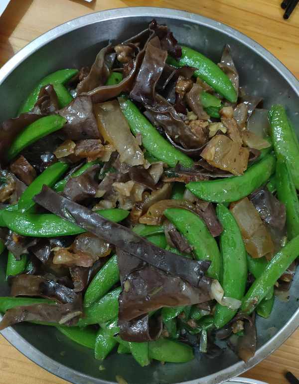 荷蘭豆和木耳我加瞭些肥肉一起炒,看著很簡單的一道菜,吃起來很爽口,傢人們都很愛吃。