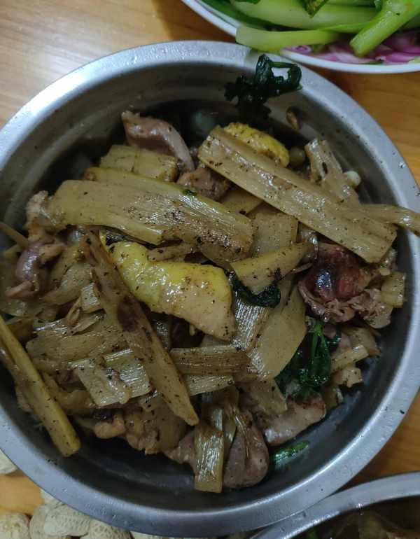 婆婆殺的雞,我把雞雜分瞭出來,用來和酸筍一起炒瞭。其實酸筍炒雞雜這樣搭配也很不錯的,酸筍很下飯,吃一點兒酸筍,可以扒幾口飯。平常我隻吃一碗飯的,隻要飯桌上有酸筍我就能吃2~3碗飯。
