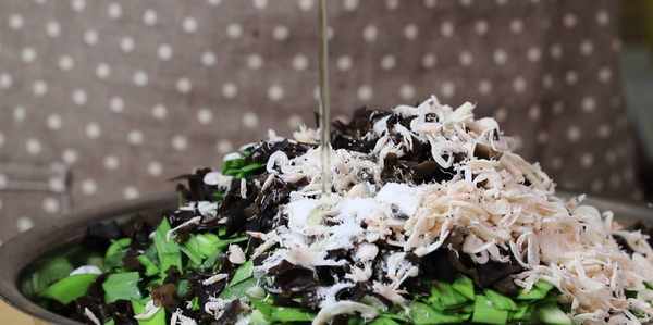步驟9把雞蛋碎,粉絲碎,韭菜末,木耳,蝦皮,加入鹽和香油拌勻;