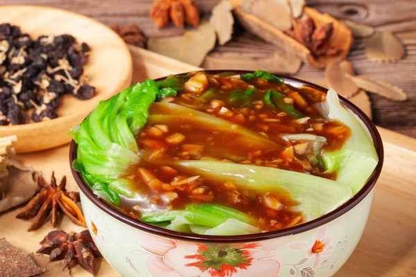 白糖將湯汁拌勻調入適量水淀粉使湯汁粘稠,最後再淋入少許料油出鍋澆在生菜上即可。