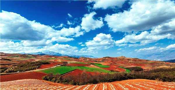 東川紅土地位於昆明市東北,因土壤裡含鐵、鋁成分較多,就形成瞭炫目的赤紅色彩。