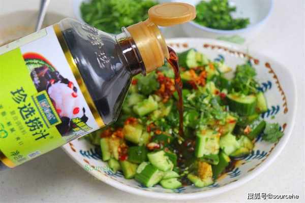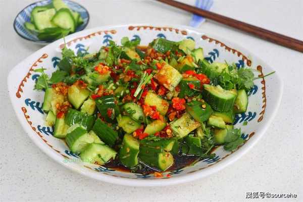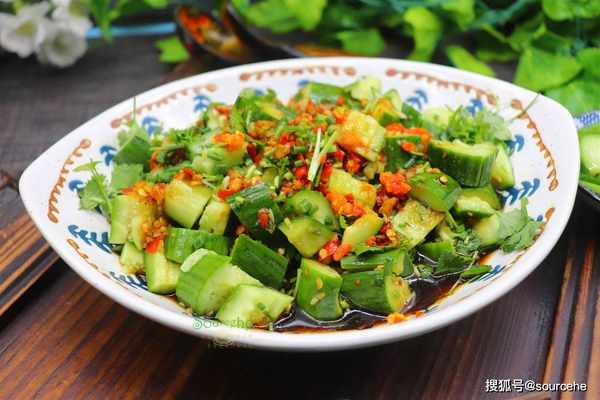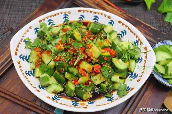 【sourcehe溫馨小貼士】1.拌黃瓜的盤子要大,容易攪拌,撈汁多,快速入味。如果自己用生抽、醋、鹽,就需要少放,黃瓜醃制出很多汁。2.優質的黃瓜個頭不大,帶著花蕾,瓜蒂翠綠新鮮,沒有蟲眼。3.拌黃瓜的大蒜、辣椒需要澆熱油,爆香,這樣的拌黃瓜很香很好吃。