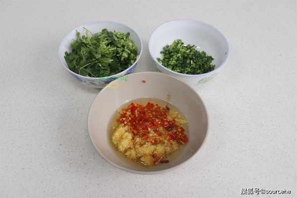 步驟1:備菜,香蔥、香菜,分別清洗幹凈,切好裝入碗裡。大蒜、紅辣椒分別清洗幹凈,剁碎,鍋裡燒熱油,澆油在蒜末辣椒碗裡,很香。