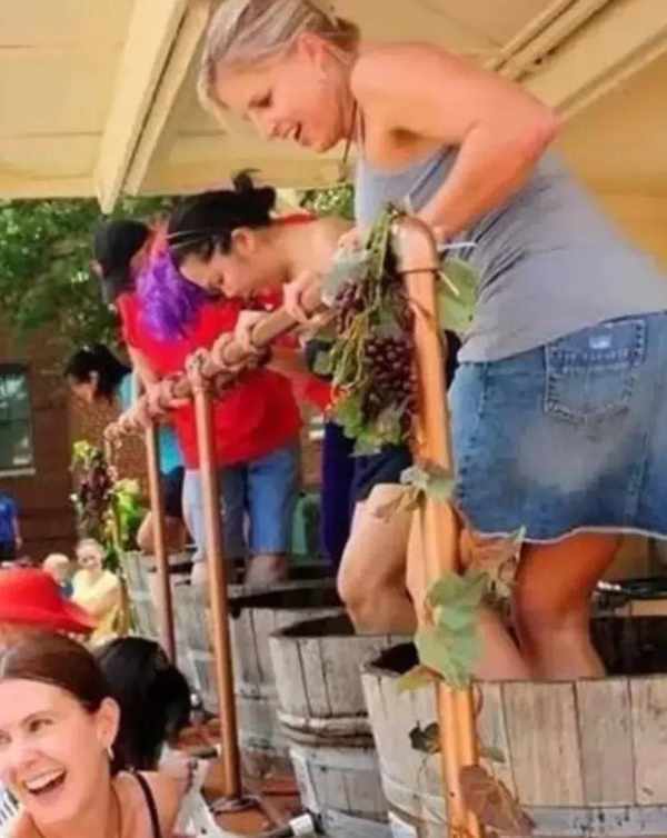 看這些照片,會發現除瞭少女還有好多大叔用腳踩葡萄,是波爾多酒的重要釀制工藝之一,可使紅酒味道豐富避免苦澀[呲牙]