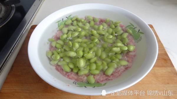 2.醃制好的肉末放入蒸碗中,然後把毛豆去殼清洗幹凈,放在上面,接著倒入半碗清水。