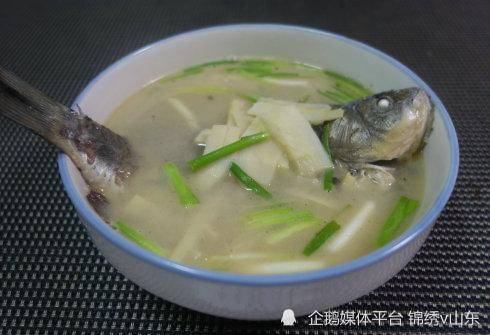 2、白鯽魚處理幹凈,用輕油慢火煎至兩面金黃色(煎時灑點白酒)時,加入適量清水煮沸5分鐘後,加入備好的春筍絲、如意菜,再煮5分鐘,放進薑絲、香蔥粒、精鹽調味,即可。
