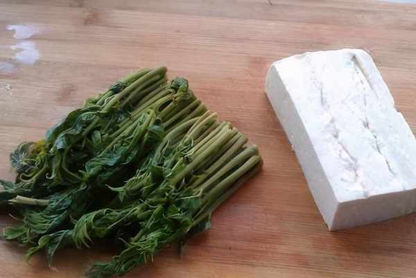 將新鮮的香椿芽清洗兩遍,放到水中加點食鹽焯水然後過涼水控幹水分。最好也將豆腐焯一下水,這樣能去除豆腥味。將香椿芽切碎、豆腐切方形小塊一起放入盆中,撒點食鹽醃制一會,這樣能更好地入味。最後倒入適量的生豆油拌勻就可以瞭。