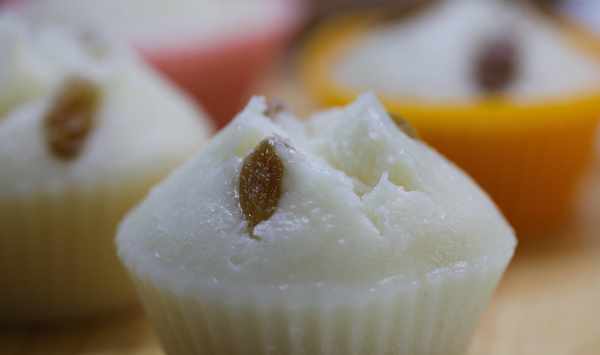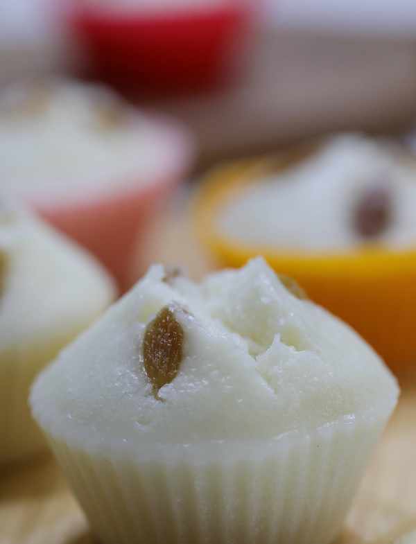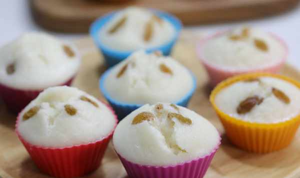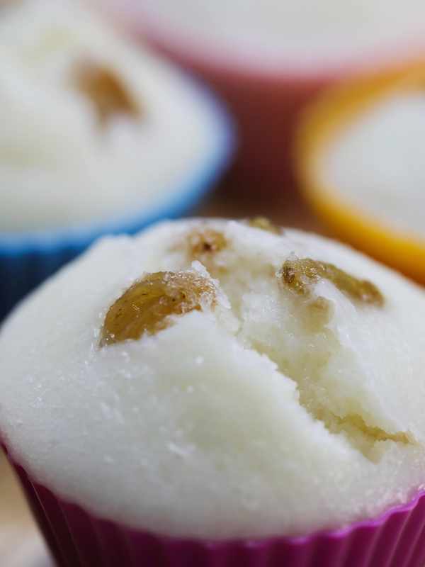 -把面糊裝進發糕模具中,8分滿即可,再放入幾粒葡萄幹,蓋上蓋子大火蒸12分鐘。