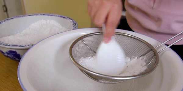 3、再準備一個盆、篩網。把粉通過篩網過一遍,一定要保持粉是均勻的、散散、細小顆粒狀。