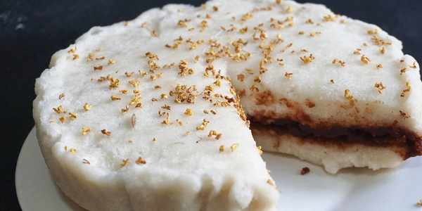 5、蒸桂花糕的時間可以做一下夾心,我直接用的豆沙,比較方便,大傢也可以換成任何自己喜歡的食材。