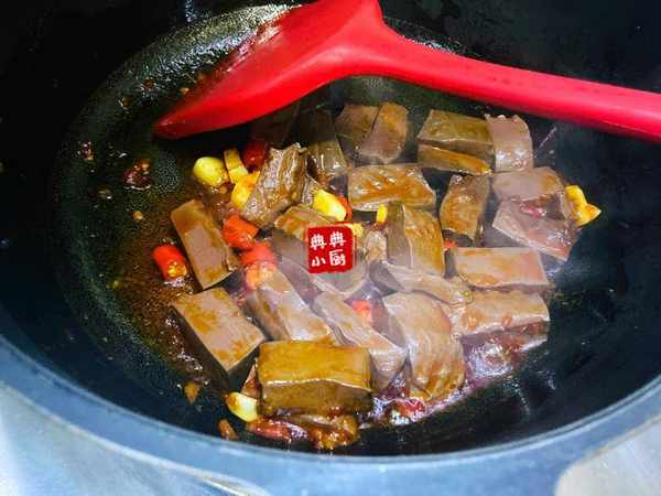 把焯過水的鴨血倒進去,翻炒至包裹上醬的顏色就差不多瞭。