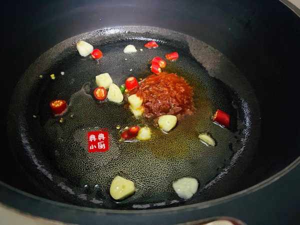 起油,放蒜,紅尖椒,再來一勺辣椒醬,燒出香味。