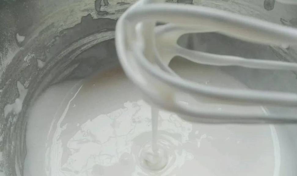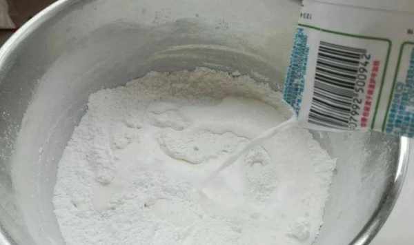 ■先將粘米粉,泡打粉過篩,放入糖混合攪拌均勻,倒入牛奶;