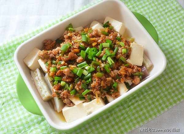 豆腐蒸瞭七八分鐘後,將肉末倒進去,再蒸兩分鐘。最後撒些蔥花,這道菜就做好瞭。